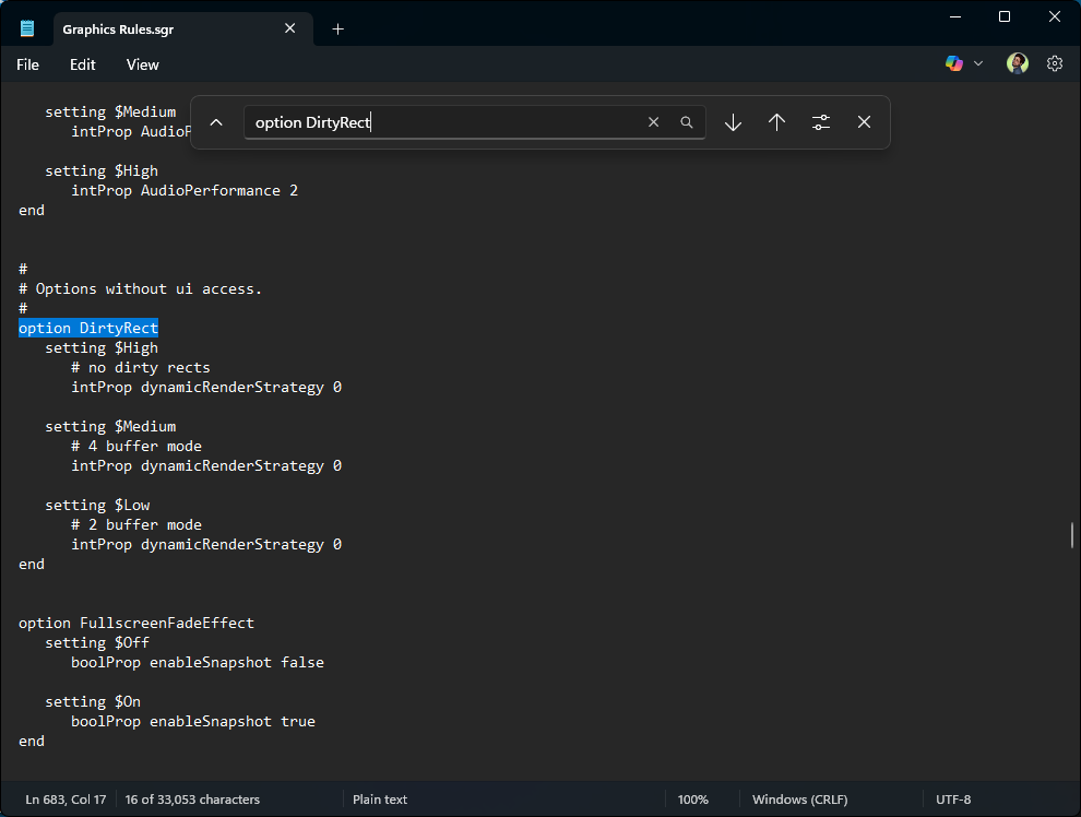 On your keyboard tap “Ctrl + F” and type in “option DirtyRect” and tap “Enter”