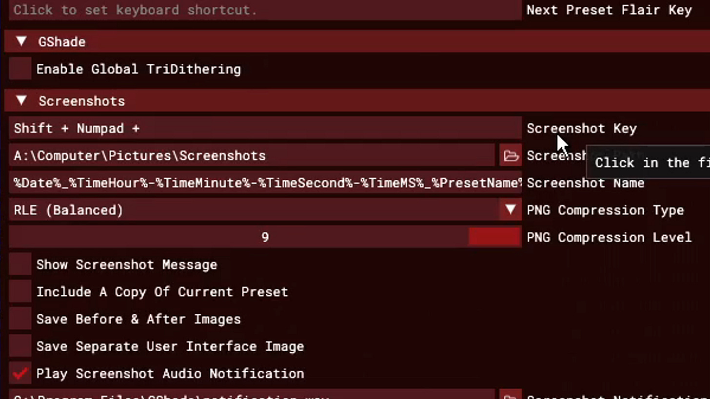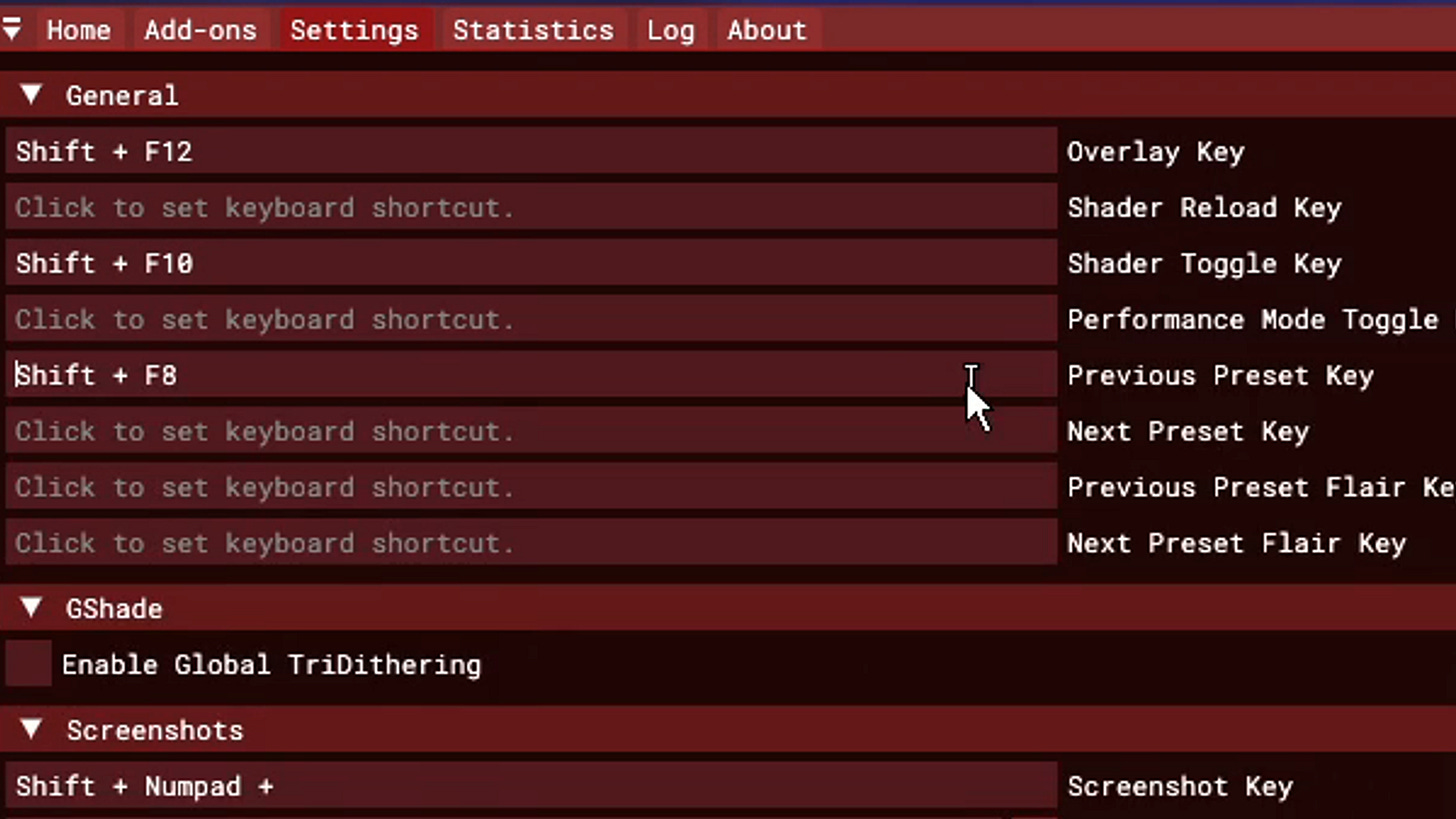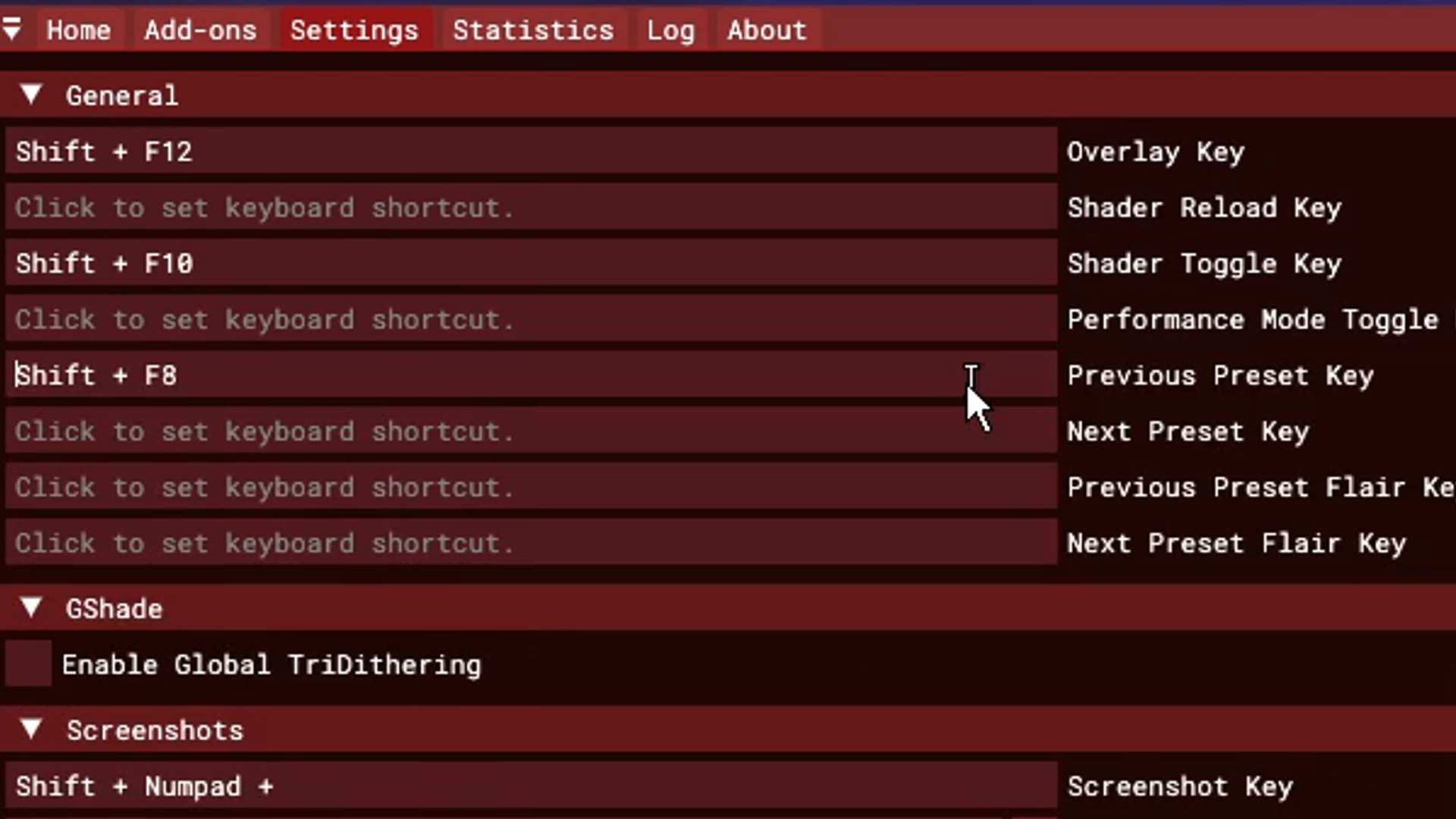 Click “Settings” and set your Keys for GShade. “Overlay Key” “Shader Toggle Key” and “Previous Present Key” are the ones that are most important.