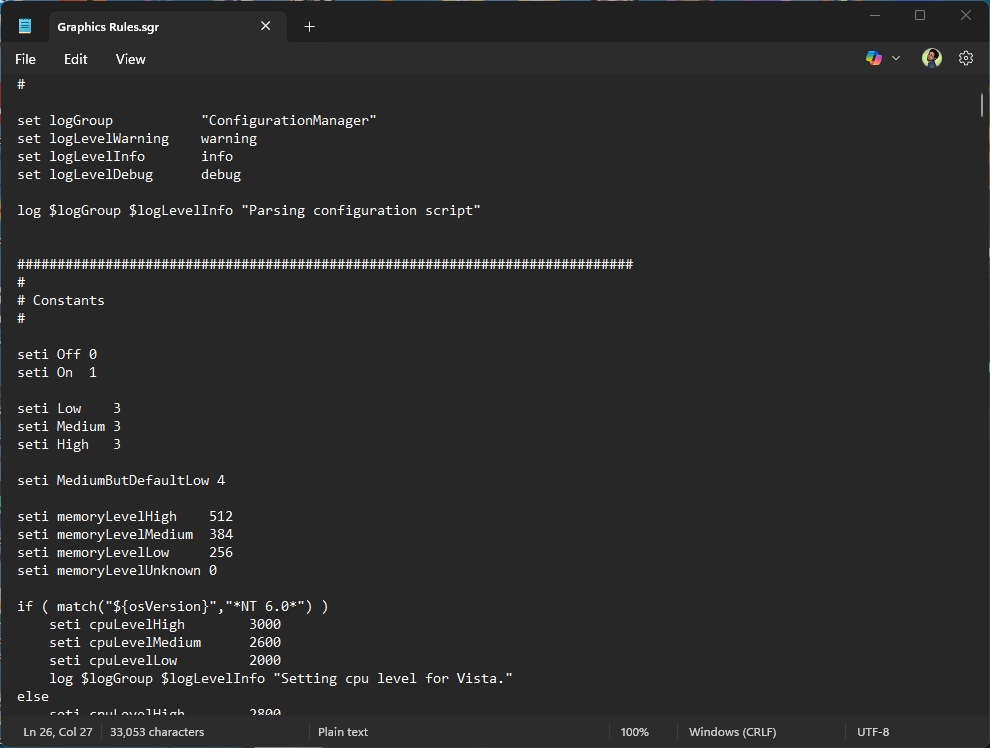 Go back to change directory from “TSBin” to “TSData” to “Res” to “Config” and open “Graphics Rules.sgr” in Notepad or any similar software.