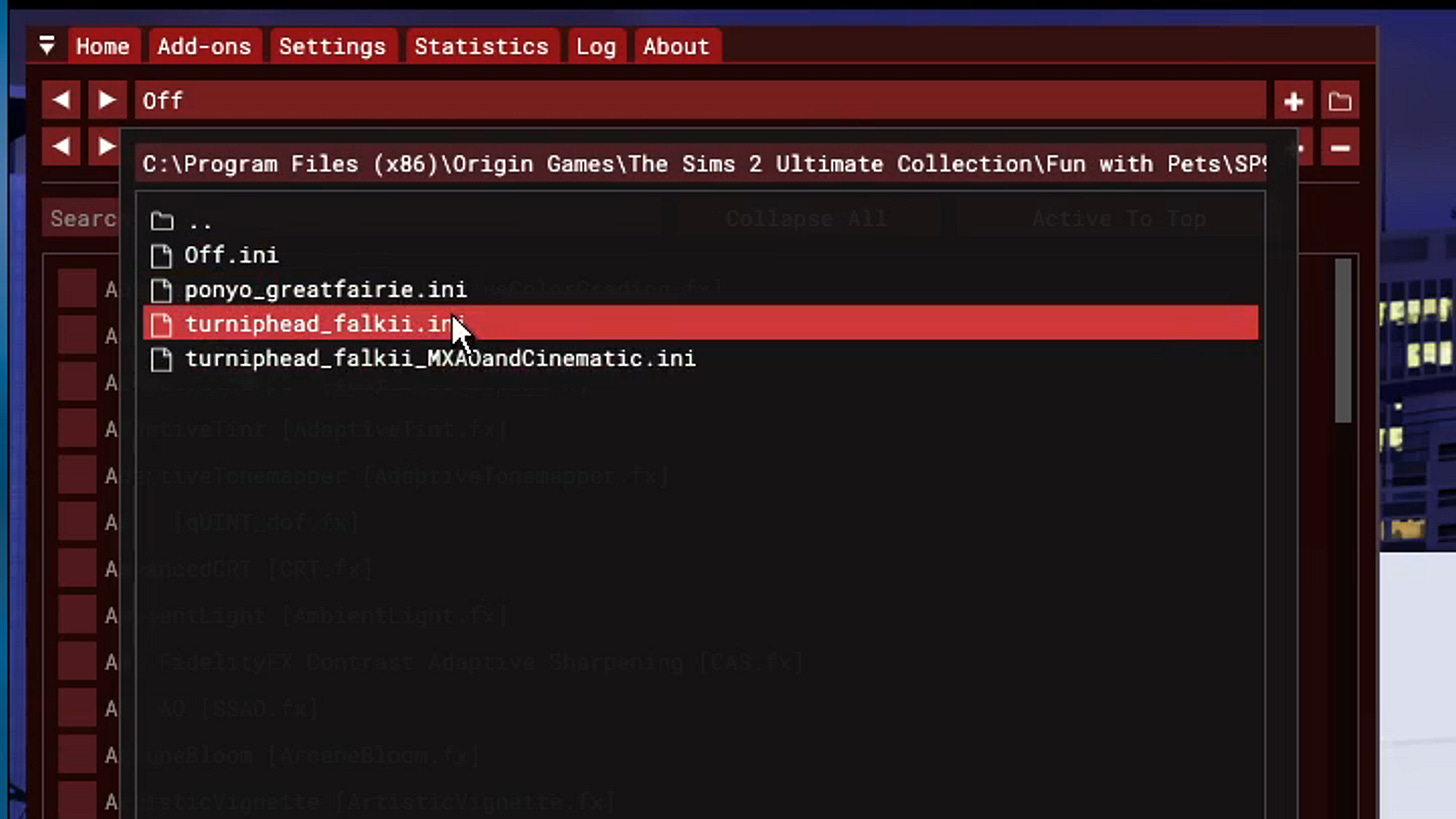 Go online and find your presents for your Sims 2 game and pasted it in the “Customs” folder located here “C:\Program Files (x86)\Origin Games\The Sims 2 Ultimate Collection\Fun with Pets\SP9\TSBin\gshade-presets\Custom”